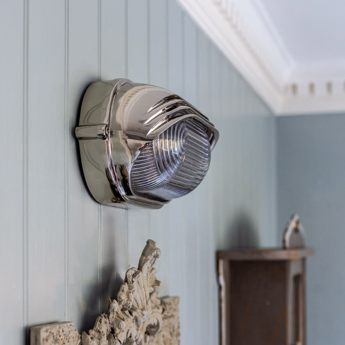 Nástěnné svítidlo Marlborough Eyelid Bulkhead je ručně vyrobeno z masivní mosazi a představuje sofistikovaně přepracovanou verzi původního námořního svítidla. Vyniká tlustým prizmatickým sklem a vysokým krytím IP65, díky čemuž je ideální jak do koupelny, tak do venkovního prostředí.