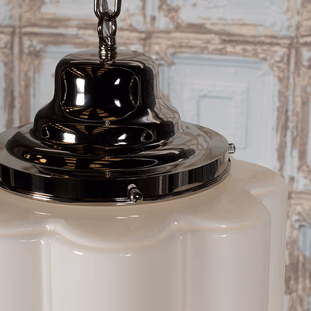 Glasshouse Pendant – závěsné svítidlo z masivní mosazi a kvalitního skla ve variantě opálové. Nadčasový design inspirovaný 20. stoletím v provedení polished nickel.