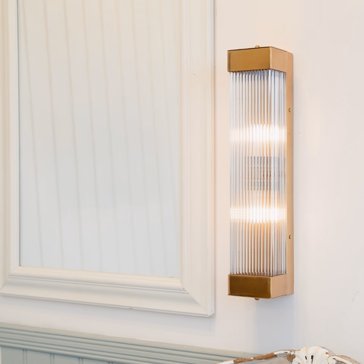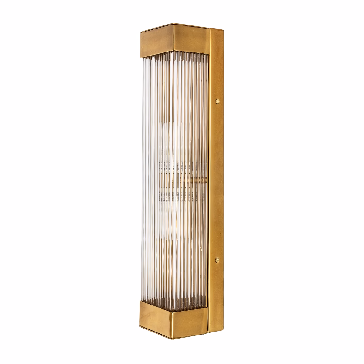 Nástěnné svítidlo Gatsby Tall, inspirované estetikou Art Deco, vyniká svým prodlouženým obdélníkovým tvarem a ručně žebrovaným sklem, které vytváří jemné, rovnoměrně rozptýlené světlo. Výsledkem je elegantní a kultivované osvětlení, které působí nadčasově a zároveň funkčně.