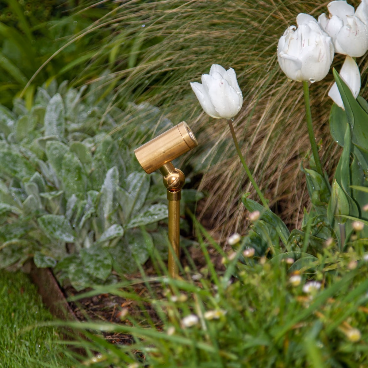 Zemní bodové svítidlo Spike Light je osazeno pevným zapichovacím hrotem a nastavitelným směrovým reflektorem z neopracované (raw) mosazi, který poskytuje světlo s chladnějším tónem.