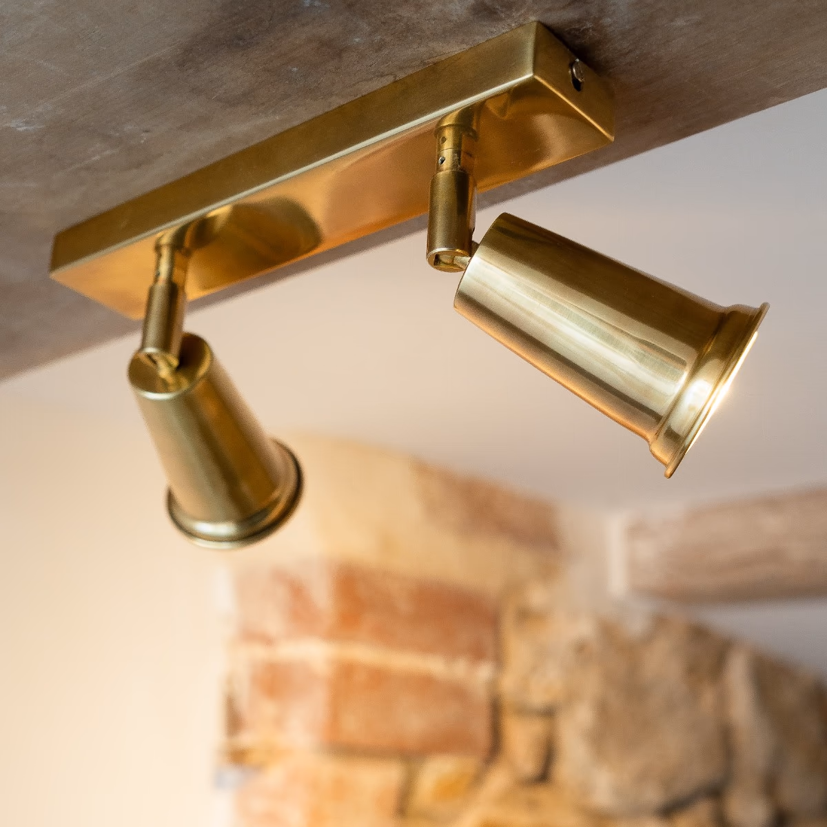 Dvojité bodové svítidlo z masivní mosazi s nastavitelnými reflektory. Ideální pro akcentní a cílené osvětlení, dostupné v několika velikostech a povrchových úpravách.