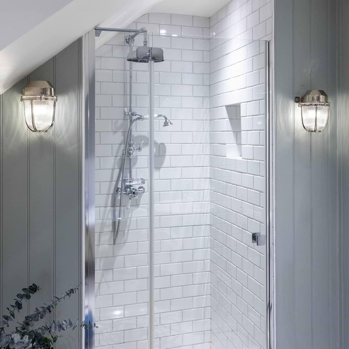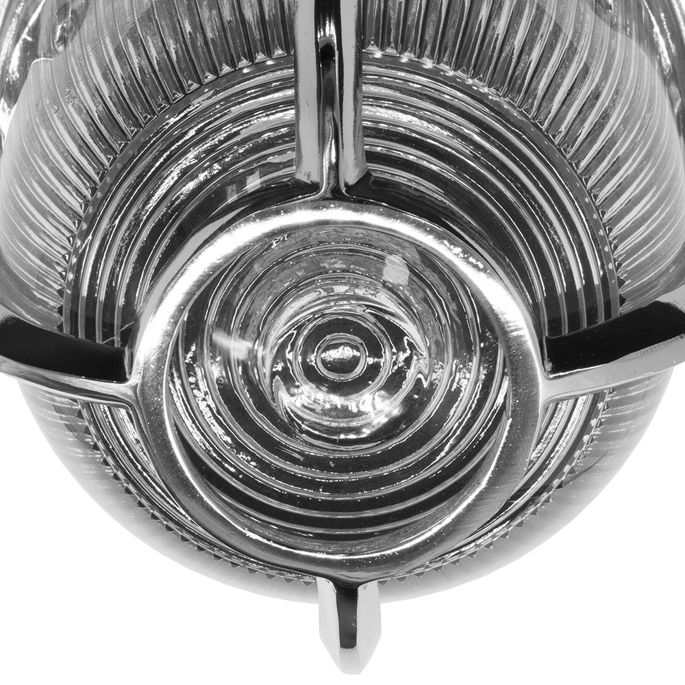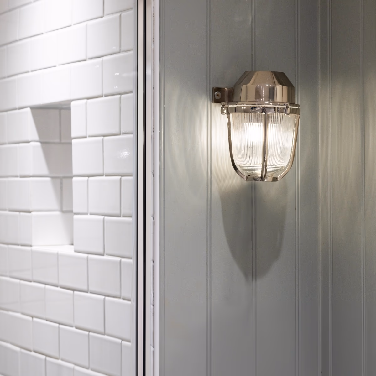 Ručně vyrobené nástěnné svítidlo z masivní mosazi s prizmatickým sklem a niklovou povrchovou úpravou. Nadčasový design, vhodné do koupelen i venkovních prostor.