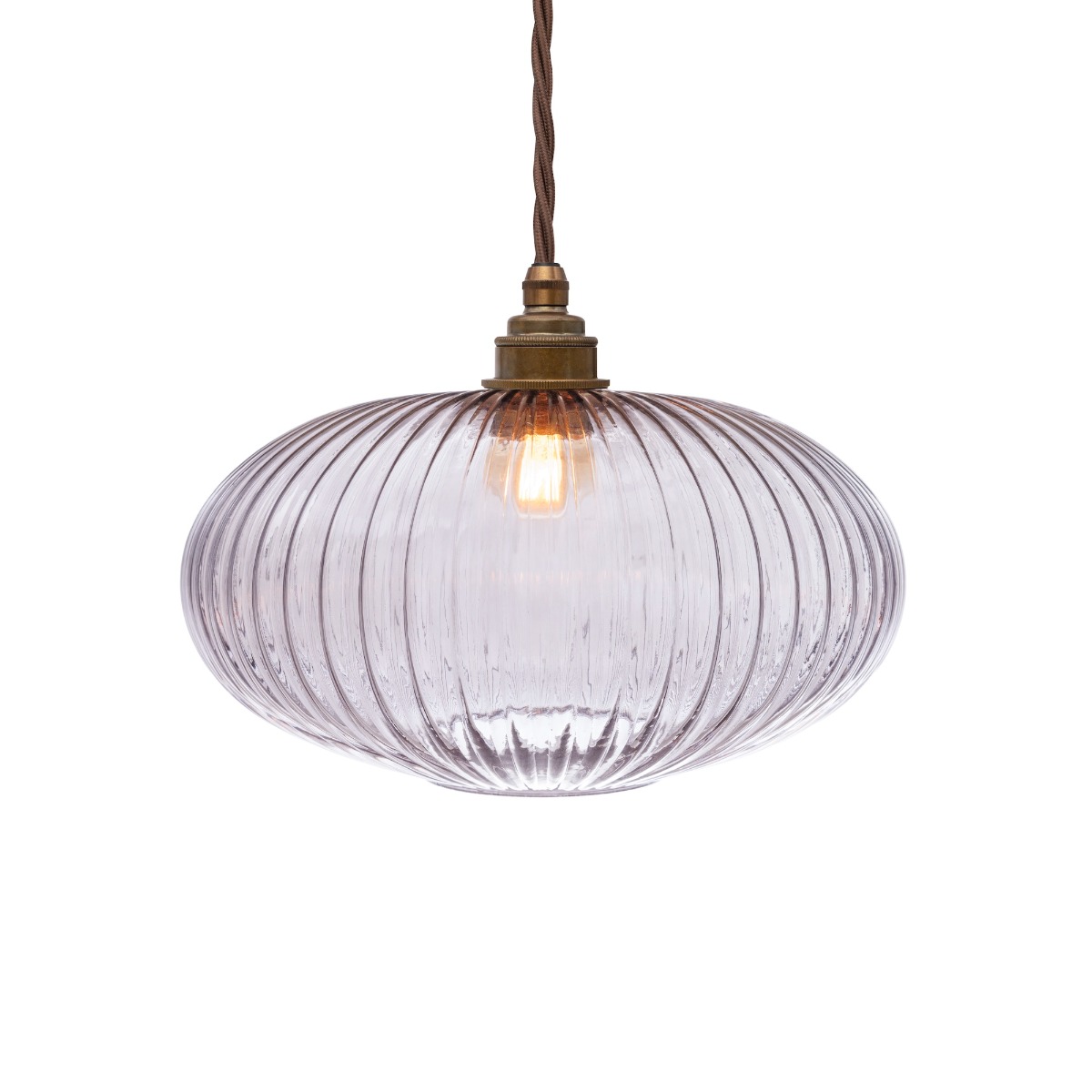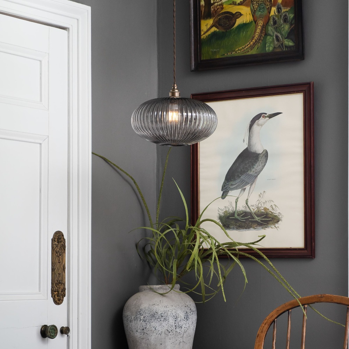 Závěsné svítidlo z ručně foukaného vroubkovaného skla v odstínu Smoked Grey z kolekce Soho Glass Library. Jemné rozptýlené světlo, elegantní vzhled a závěs o délce 1,5 m.