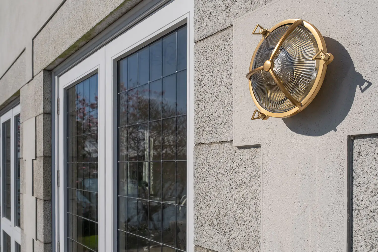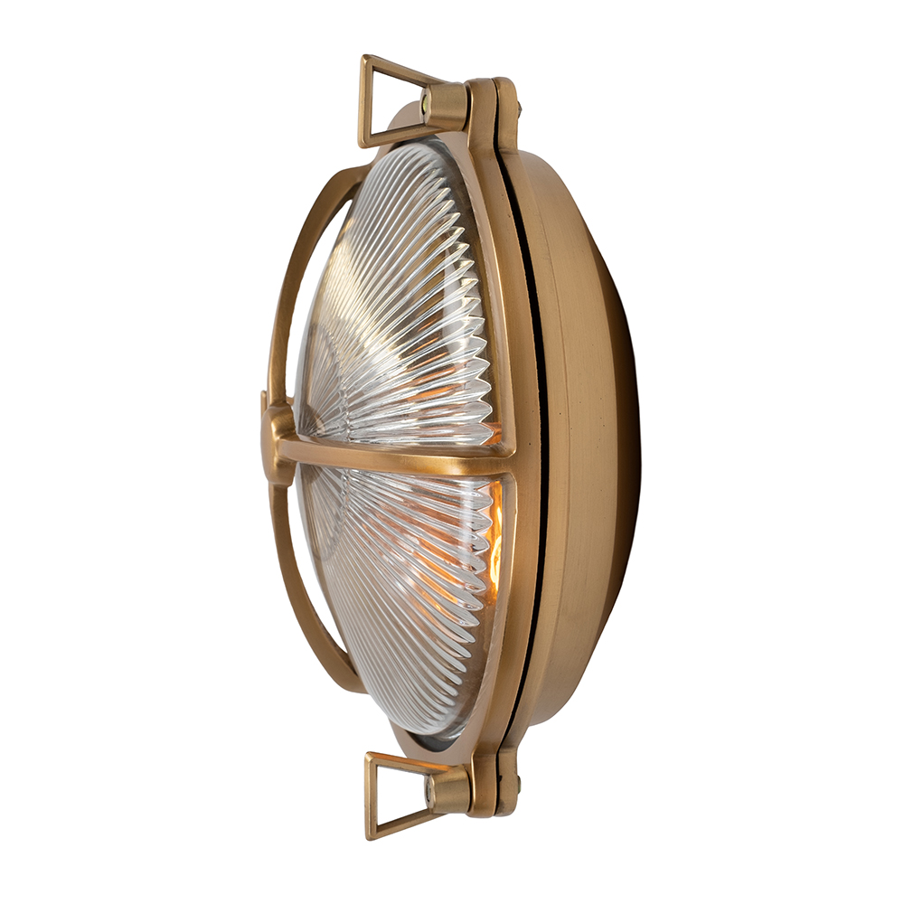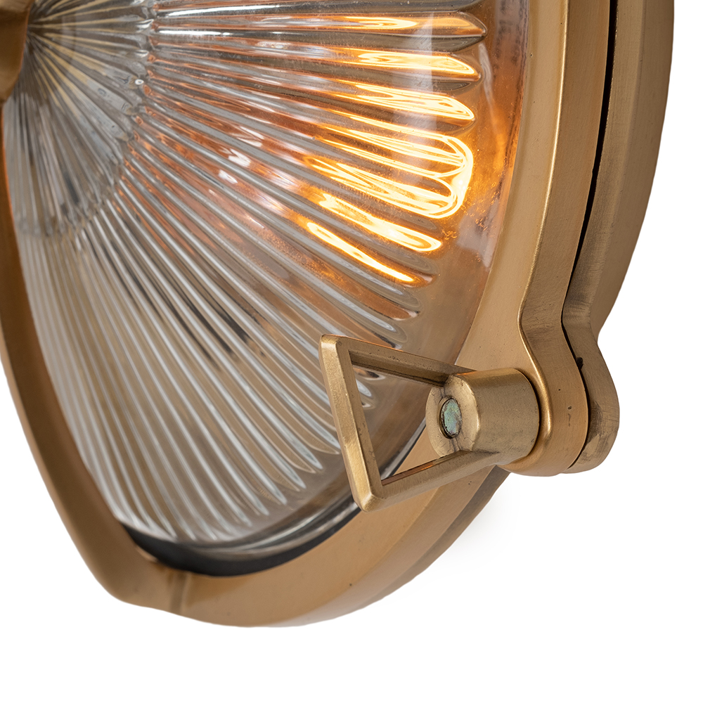 Venkovní bulkhead svítidlo z masivní mosazi s prizmatickým sklem a odnímatelným měděným krytem. Steampunkový námořnický design, krytí IP65, ruční výroba.