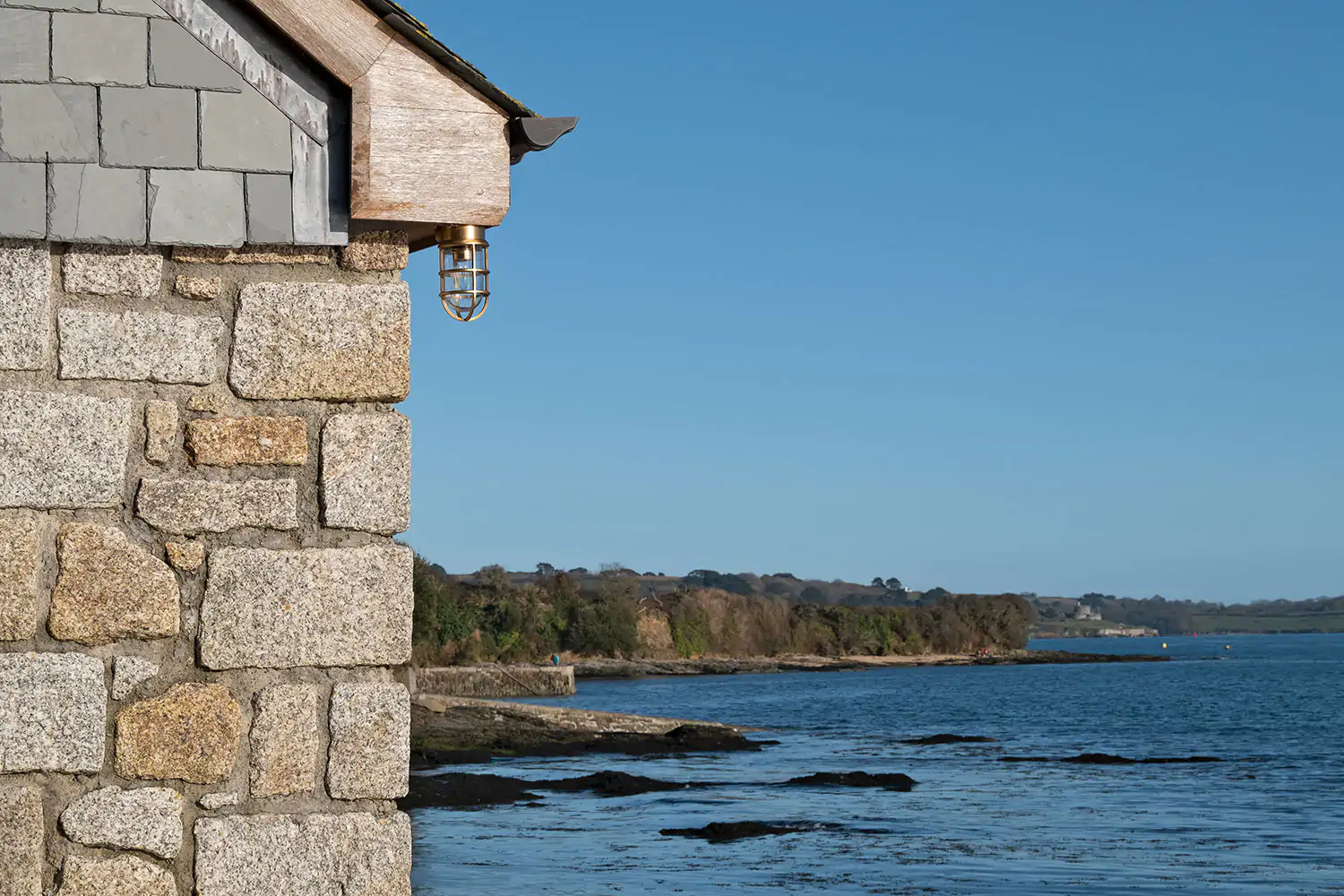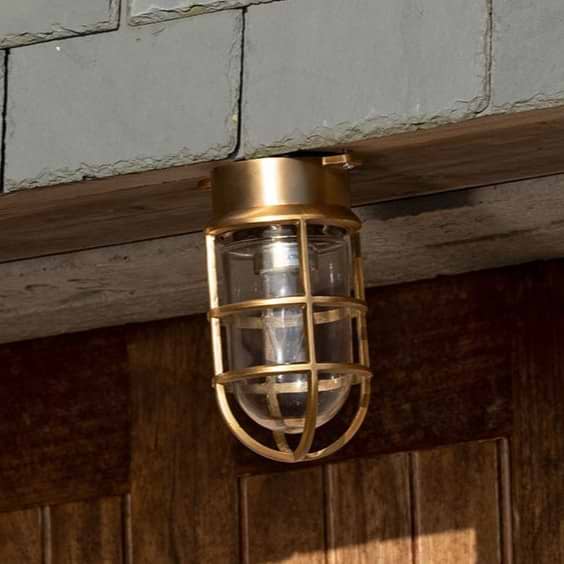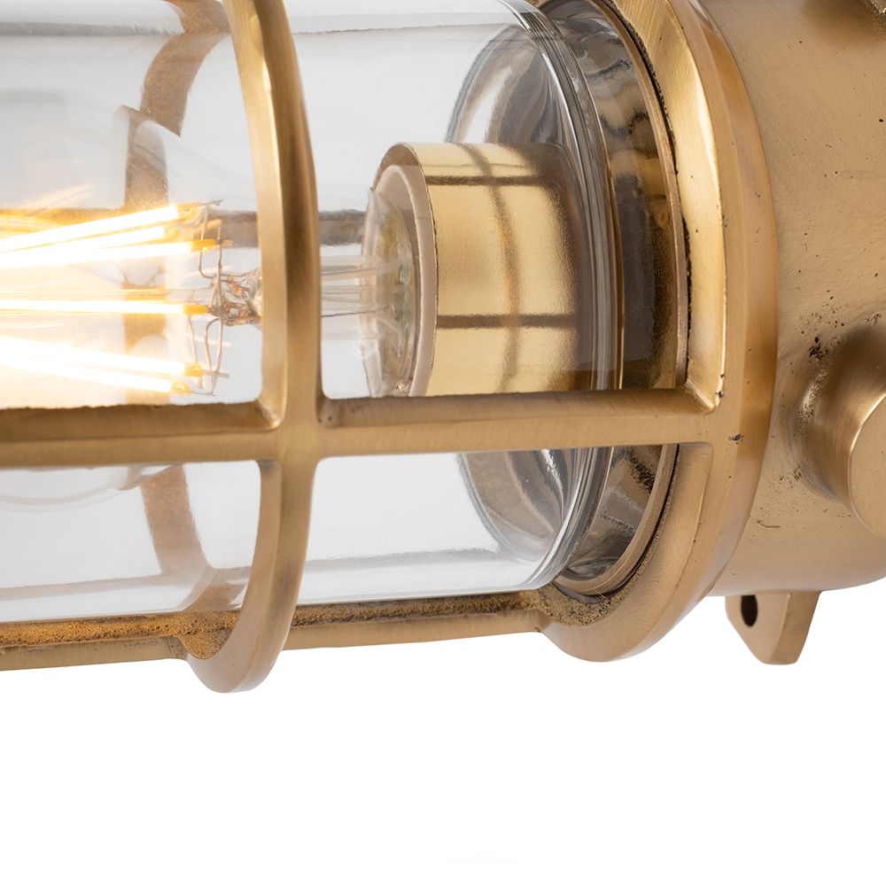 Stropní svítidlo z masivní mosazi s čirým sklem a industriálně-námořnickým designem. Ideální pro Edison LED žárovky, vhodné do koupelen i krytých venkovních prostor.