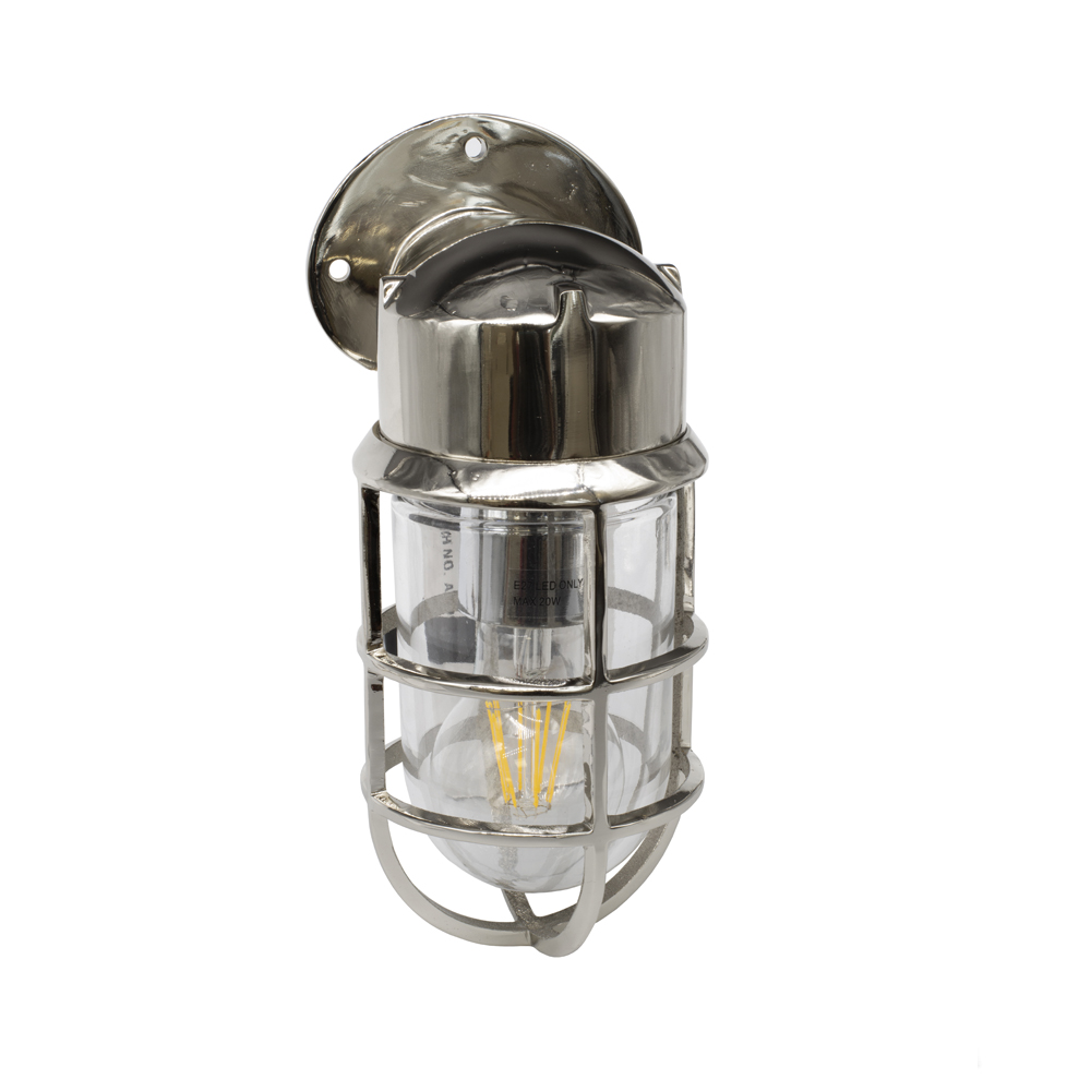 Ručně vyráběné nástěnné svítidlo z masivní mosazi s niklovou povrchovou úpravou a krytím IP65. Vhodné do koupelen i exteriéru, ideální pro Edison LED žárovky.