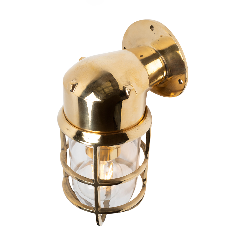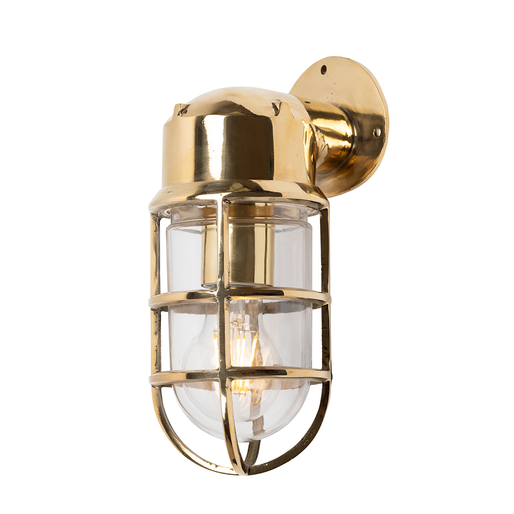 Nástěnné svítidlo z masivní mosazi s krytím IP65 a čirým sklem. Vhodné do koupelen i venkovních prostor, ideální pro Edison LED žárovky.