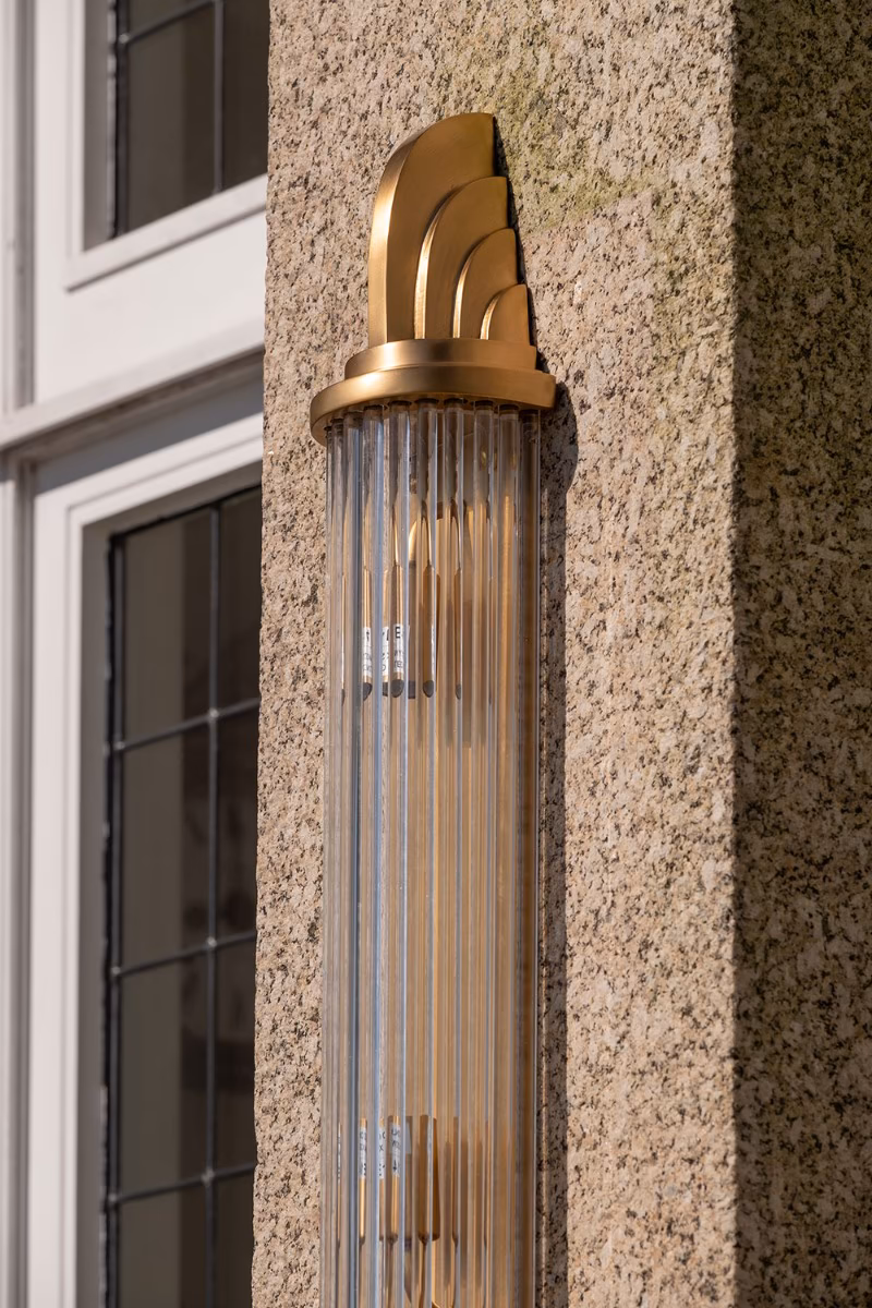 Nástěnné svítidlo Sheraton z masivní mosazi v art deco stylu s prizmatickým sklem. Vhodné do koupelen (IP44) i krytých venkovních prostor.