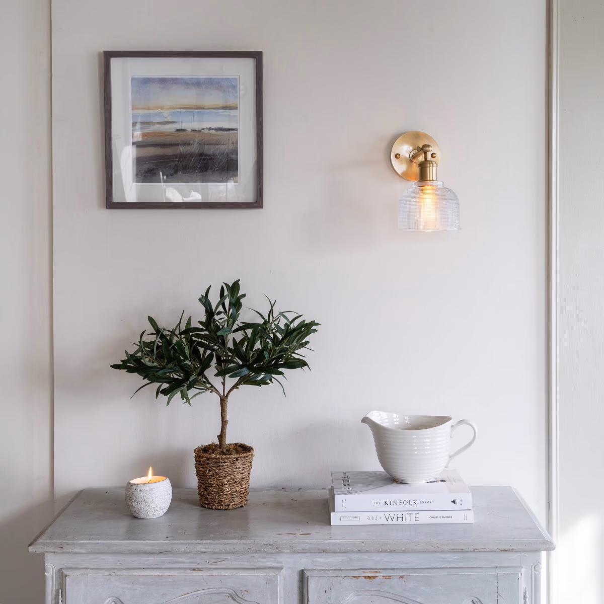 Bronte – nástěnné svítidlo s ručně foukaným prizmatickým sklem a nastavitelným ramenem. Hřejivé světlo, dostupné v mosazné nebo bronzové povrchové úpravě.