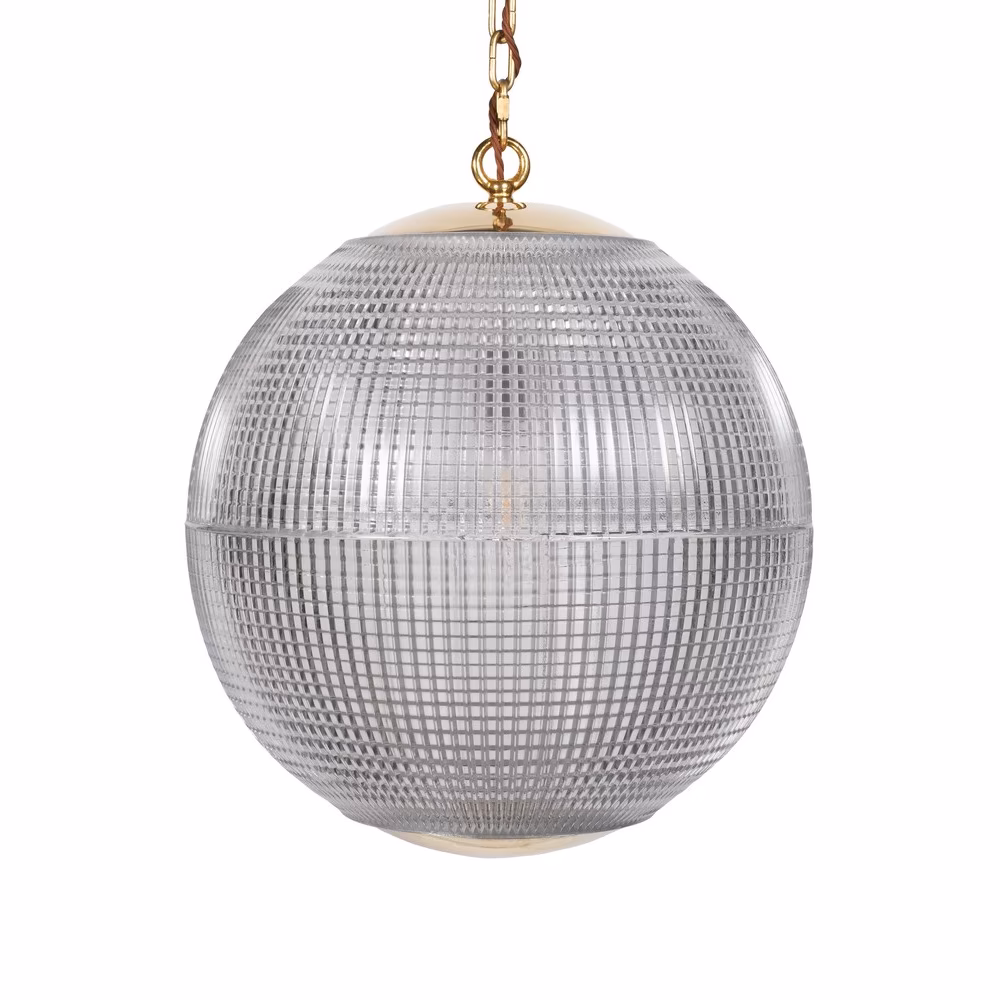Hollen Globe – ikonické závěsné svítidlo inspirované pařížskými Holophane Globe z 50. let. Texturované prizmatičké sklo a masivní mosazná konstrukce pro rovnoměrné a elegantní osvětlení.