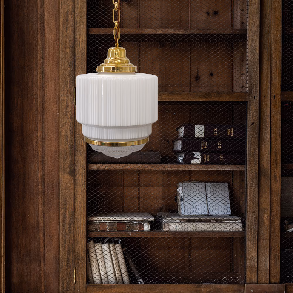 The Dean – závěsné svítidlo v neoklasicistním stylu z 20. let v leštěné mosazi. Mléčné sklo a křišťálové dno vytvářejí hřejivé světlo a okouzlující třpyt.