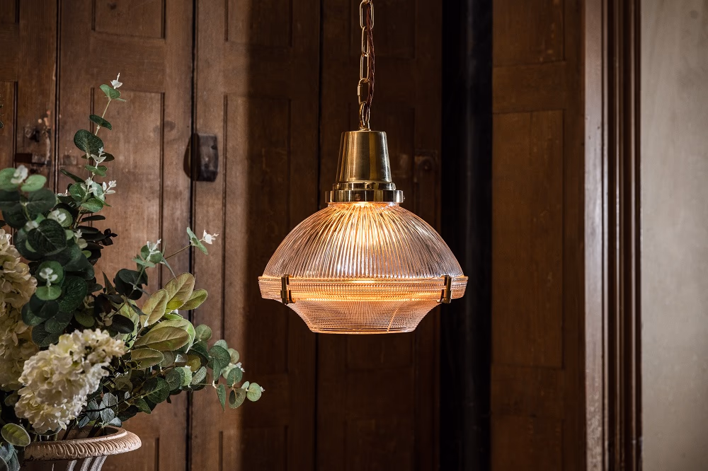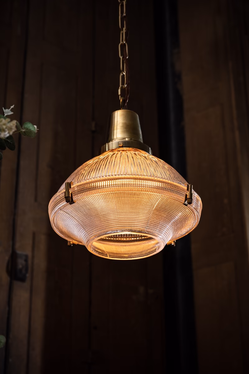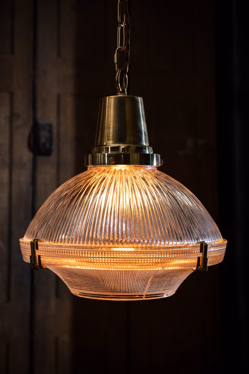 Hollen – závěsné svítidlo inspirované průmyslovým designem Brimmed Dome™ Holophane. Broušené prizmatické sklo zajišťuje rovnoměrné světlo s nádechem nadčasové elegance.