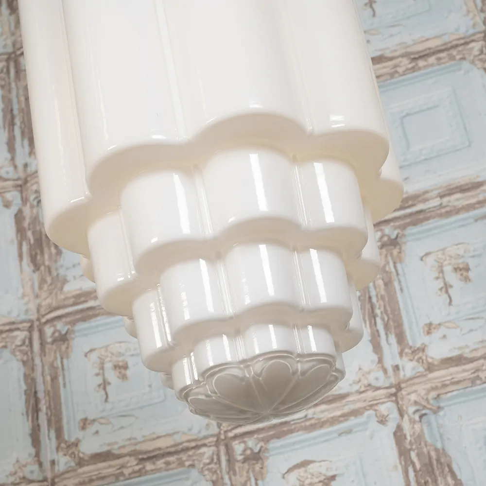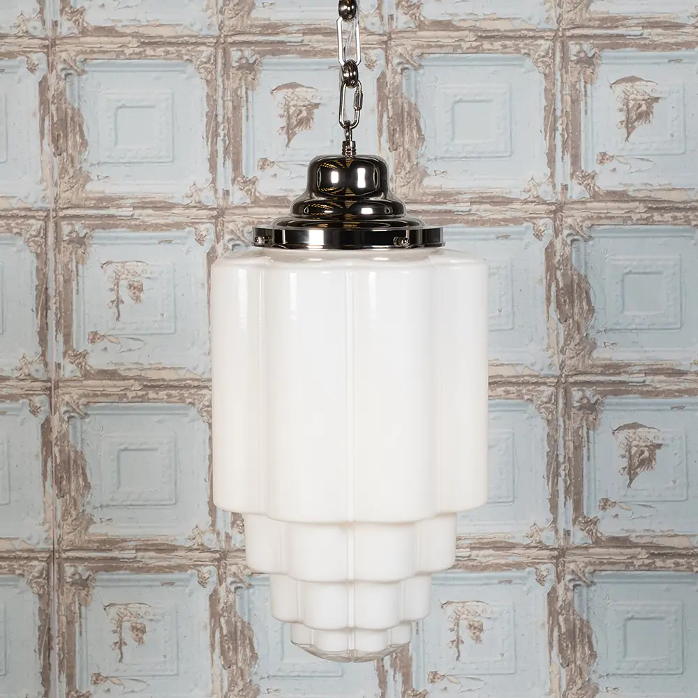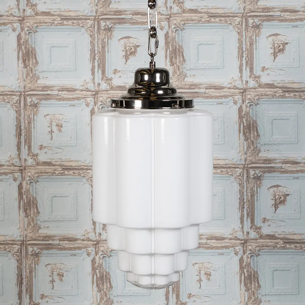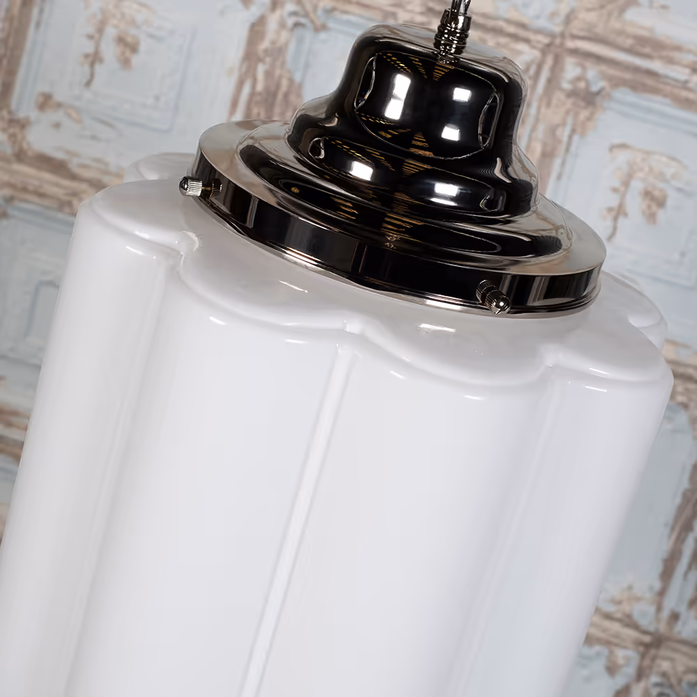 Glasshouse Pendant – závěsné svítidlo z masivní mosazi a kvalitního skla ve variantě opálové. Nadčasový design inspirovaný 20. stoletím v provedení polished nickel.
