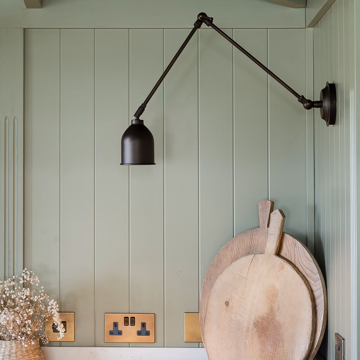 Elegantní nástěnné svítidlo s nastavitelnými rameny a mosazným kupolovým stínidlem. Ideální pro čtení, kuchyně i akcentní osvětlení, dostupné v několika luxusních povrchových úpravách.