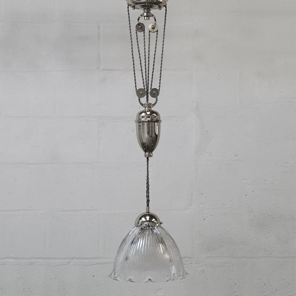 Menší skleněné stínidlo v holophane stylu s jemně tvarovanými okraji zajišťuje rovnoměrné a příjemné osvětlení. Světlo je jasné, bez nepříjemných stínů či oslnění, a dodává prostoru jedinečnou atmosféru.