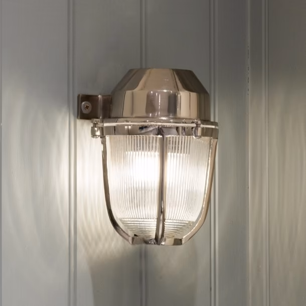 Ručně vyrobené nástěnné svítidlo z masivní mosazi s prizmatickým sklem a niklovou povrchovou úpravou. Nadčasový design, vhodné do koupelen i venkovních prostor.