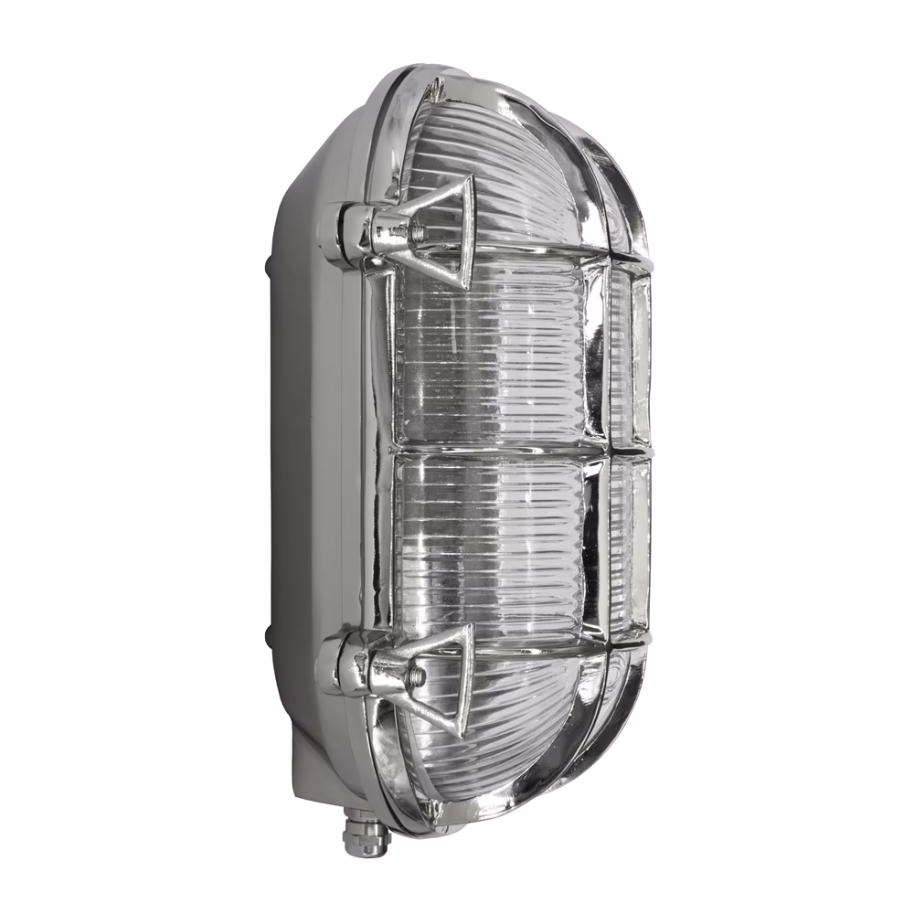 Klasický námořnický styl nástěnného bulkhead svítidla Flaxman v elegantní niklové povrchové úpravě působí výrazně a kultivovaně v jakémkoli venkovním prostoru i v koupelně. Svítidlo je ručně vyrobeno z masivní mosazi a doplněno silným čirým prizmatickým sklem, které chrání žárovku a zároveň podtrhuje vysokou kvalitu zpracování i světelný efekt.