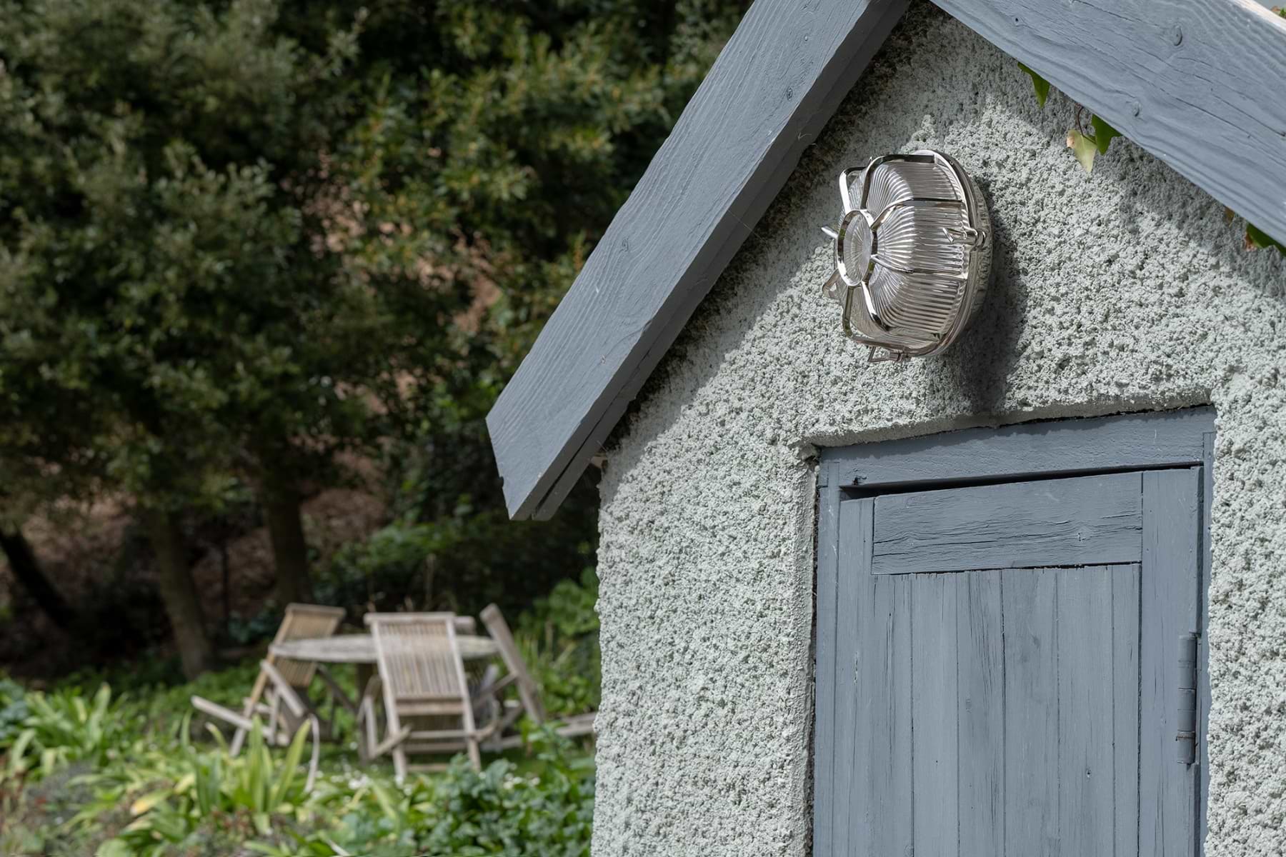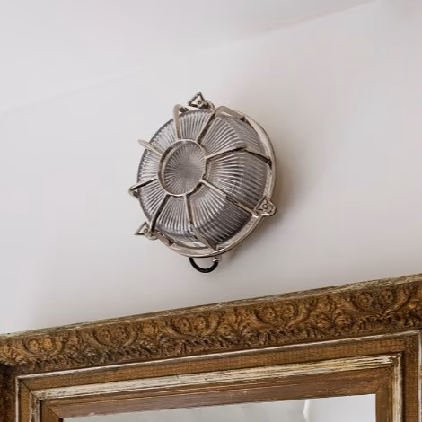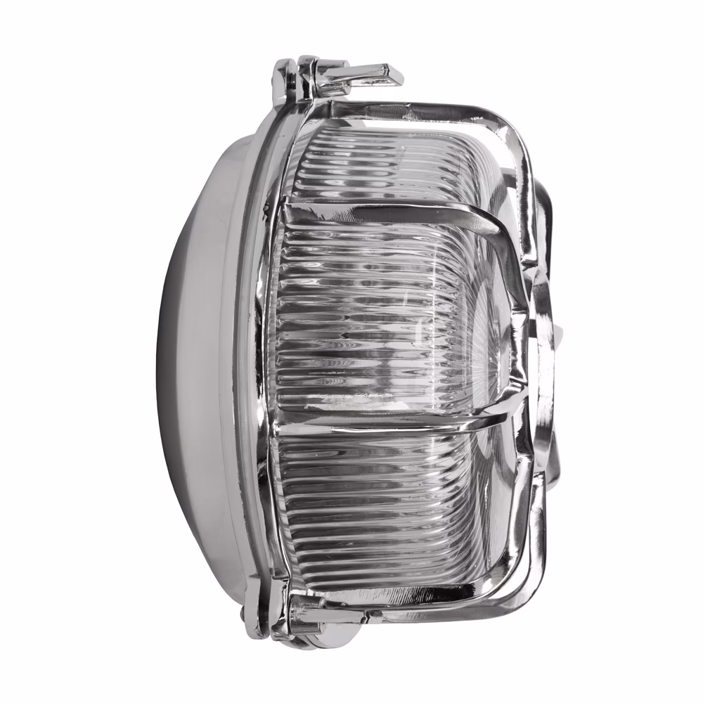 Nástěnné bulkhead svítidlo z masivní mosazi s niklovou povrchovou úpravou a krytím IP65. Vhodné do exteriéru i koupelen, ruční výroba, nadčasový námořnický design.