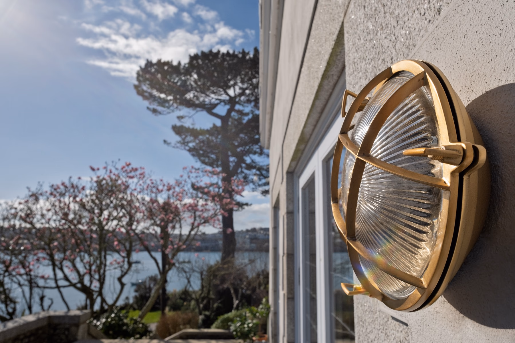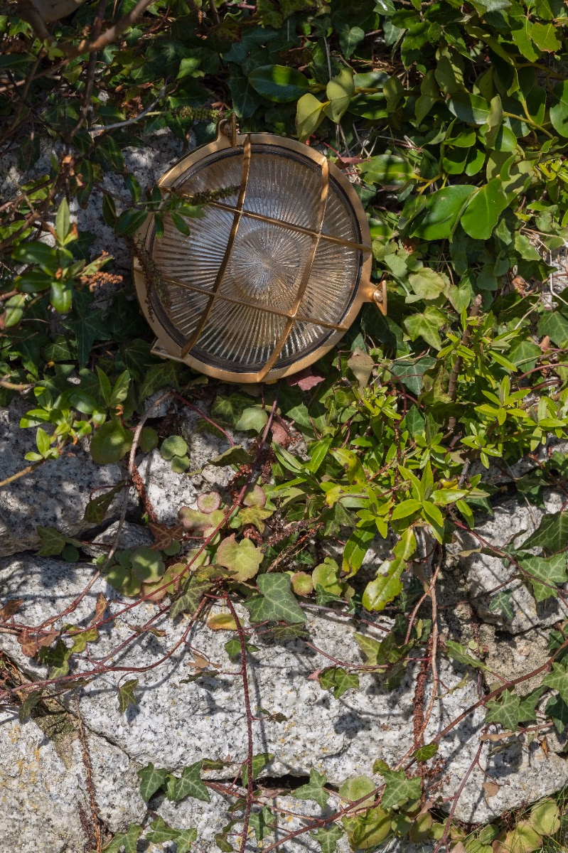 Kulaté venkovní bulkhead svítidlo z masivní mosazi s leptaným sklem a krytím IP65. Námořnický styl s lehce steampunkovým nádechem, vhodné do exteriéru i industriálních prostor.