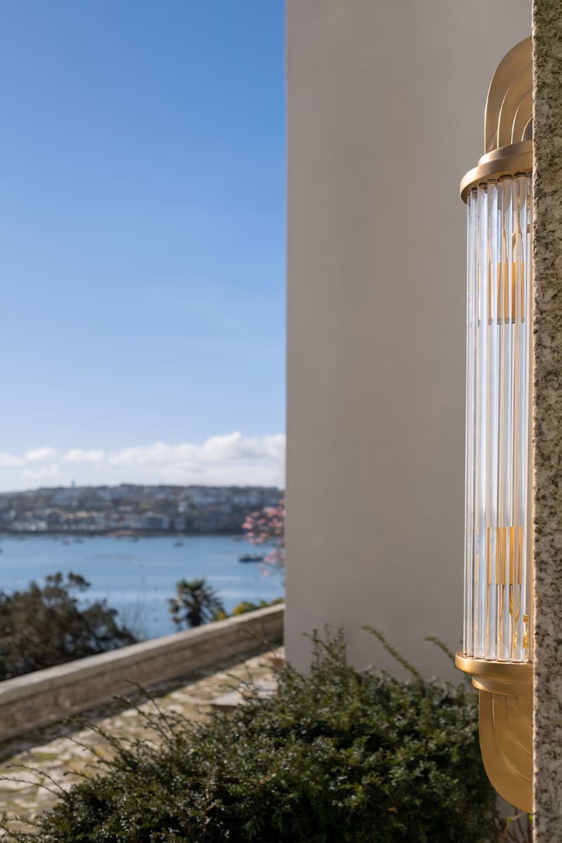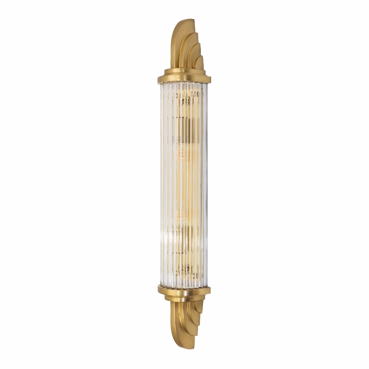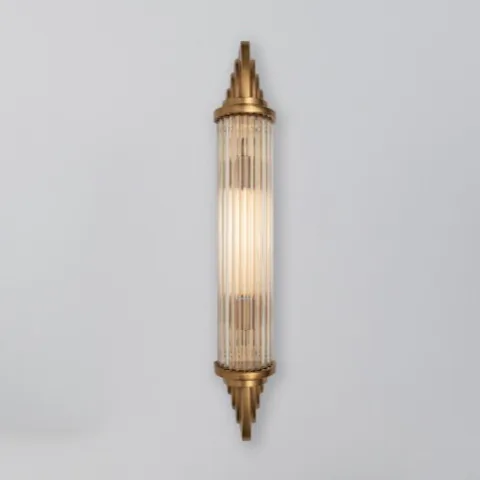 Nástěnné svítidlo Sheraton z masivní mosazi v art deco stylu s prizmatickým sklem. Vhodné do koupelen (IP44) i krytých venkovních prostor.