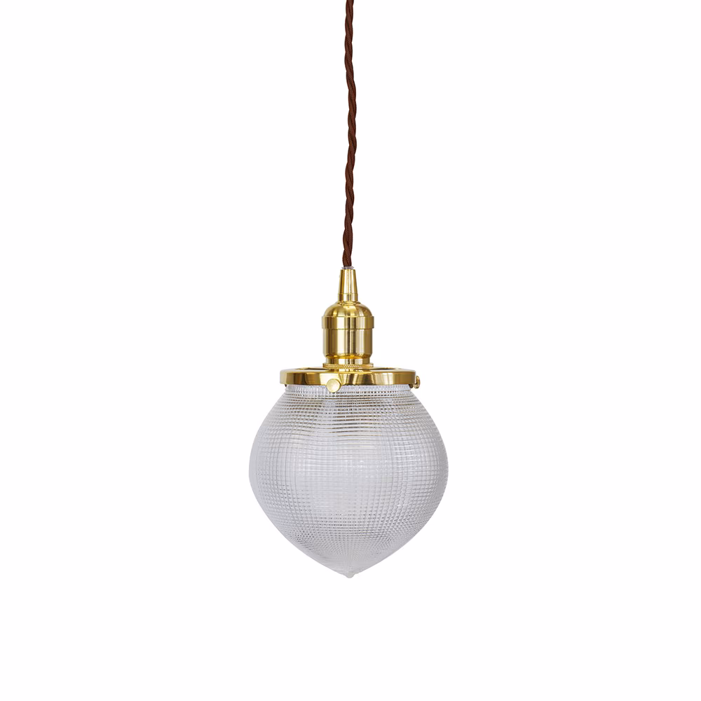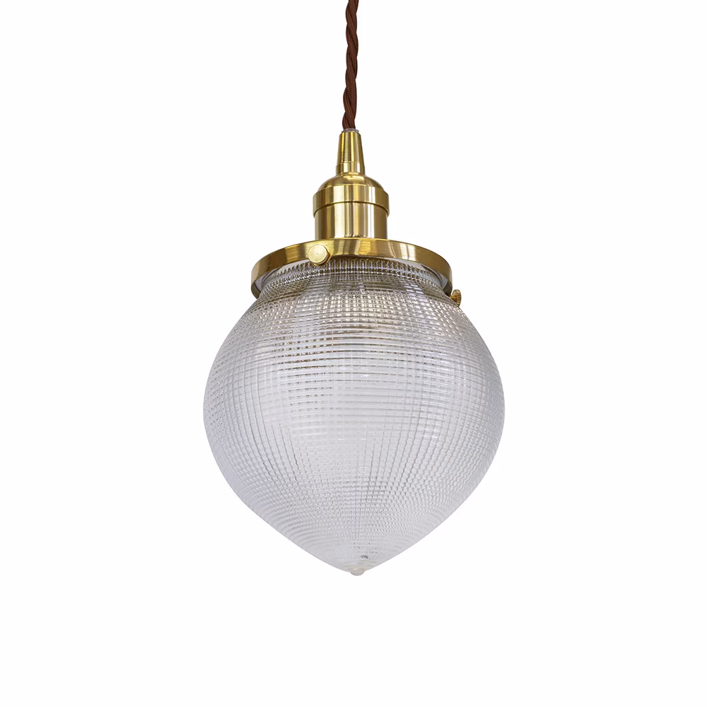 Hollen Acorn – závěsné svítidlo s prizmatickým sklem Holophane a mosaznou krytkou. Nadčasová elegance 30. let v moderním industriálním stylu.