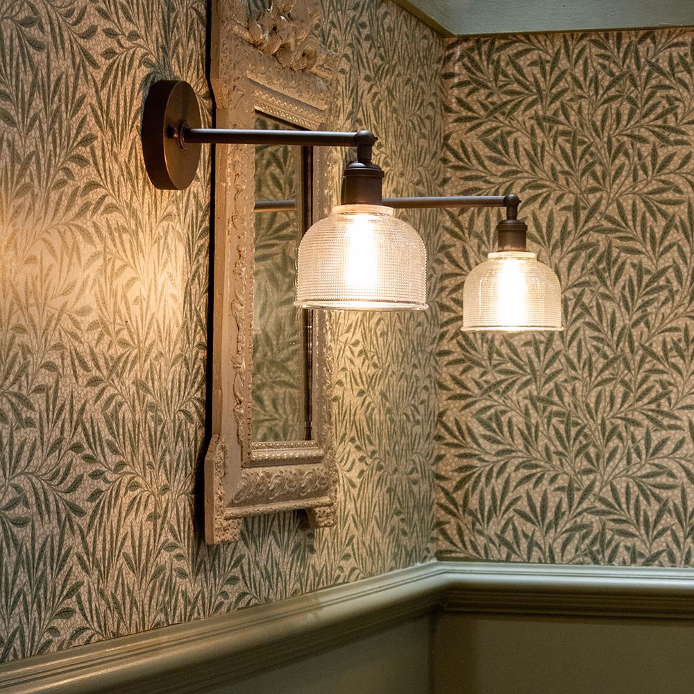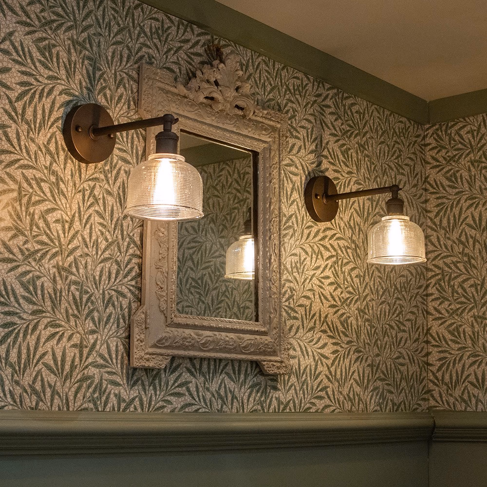Bronte – nástěnné svítidlo s ručně foukaným prizmatickým sklem a nastavitelným ramenem. Hřejivé světlo, dostupné v mosazné nebo bronzové povrchové úpravě.