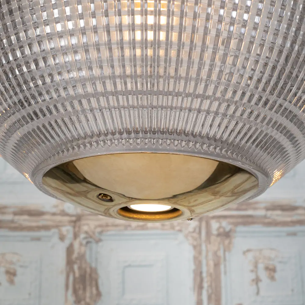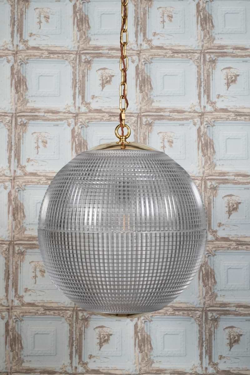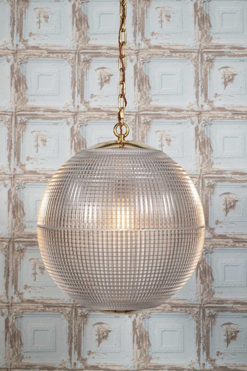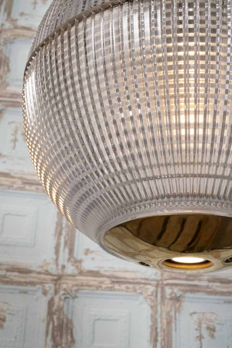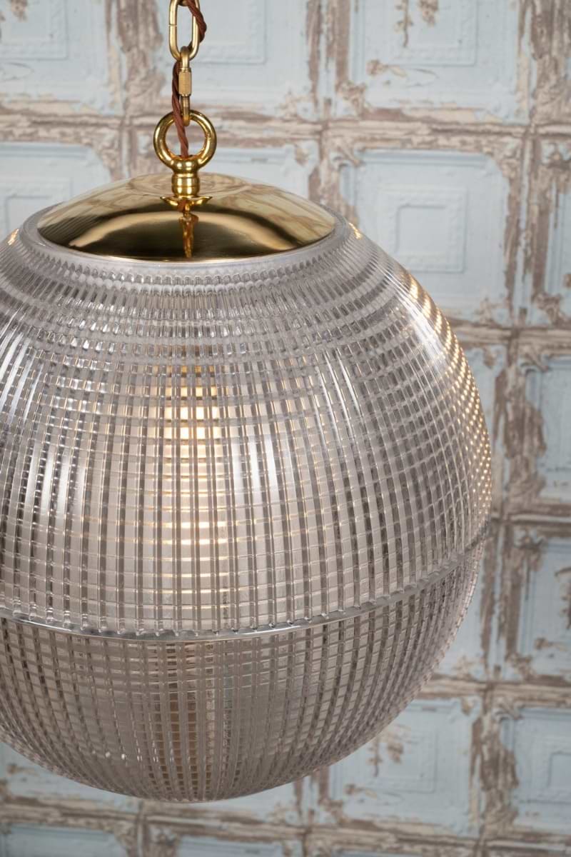 Hollen Globe – ikonické závěsné svítidlo inspirované pařížskými Holophane Globe z 50. let. Texturované prizmatičké sklo a masivní mosazná konstrukce pro rovnoměrné a elegantní osvětlení.